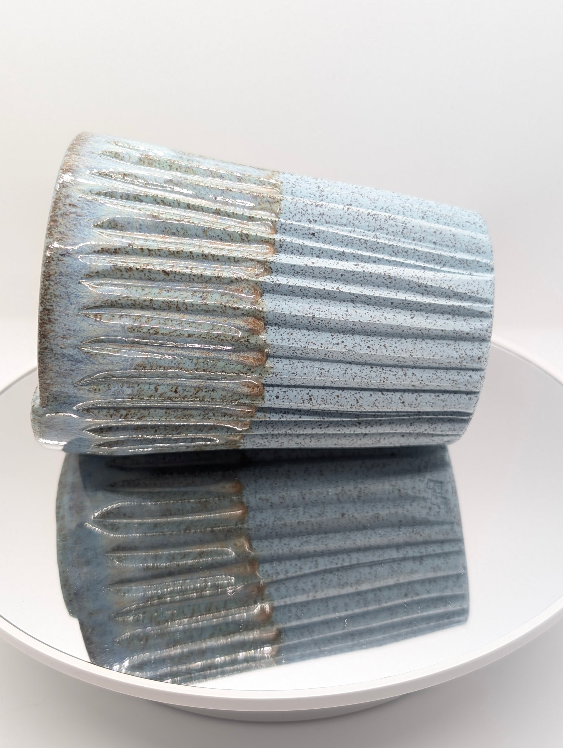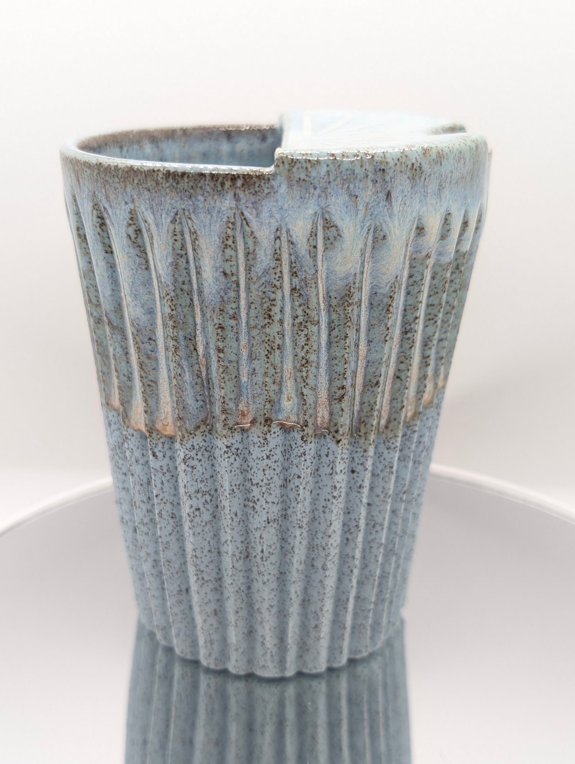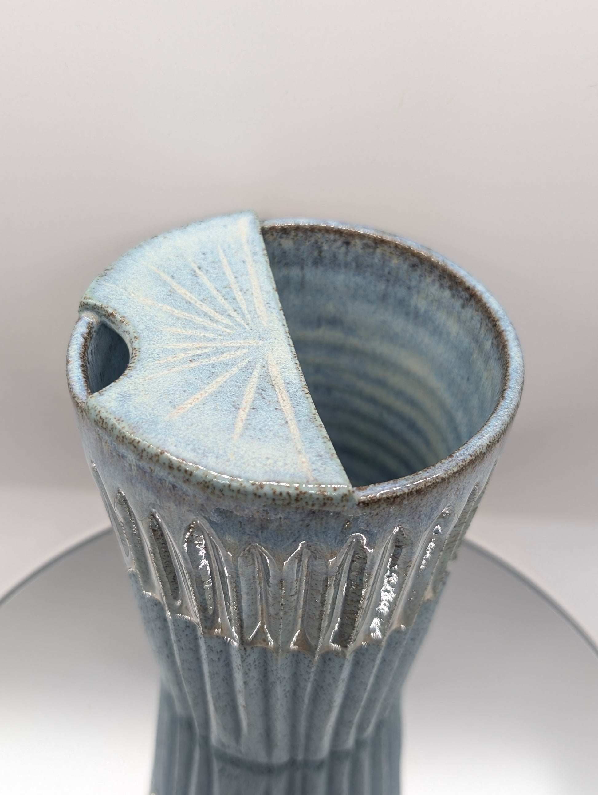 Start your day with a little sunshine. The Sunrise Sipper is a handcrafted travel mug made from sky-blue porcelain, featuring a radiant carved sunburst on a matte-finished lid insert. The secure lid with a sipping slot makes it perfect for life on the go, and its tapered base fits snugly in most vehicle cup holders. Whether you're chasing the sunrise or commuting through clouds, this mug brings a bit of beauty to every sip. Dishwasher and microwave safe.
