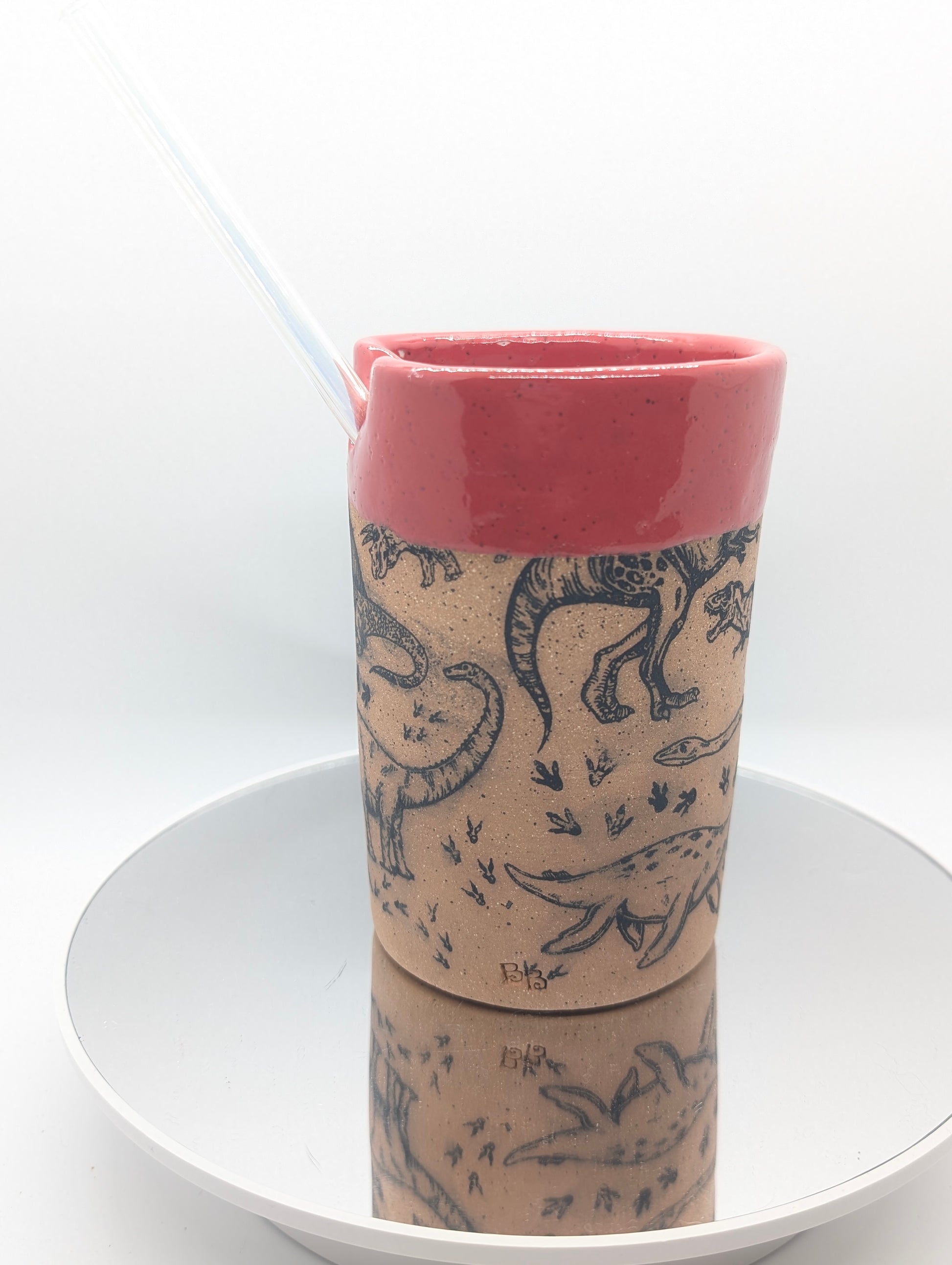 Dinosaurs all over with a bright red rim and a hole to keep your straw still.