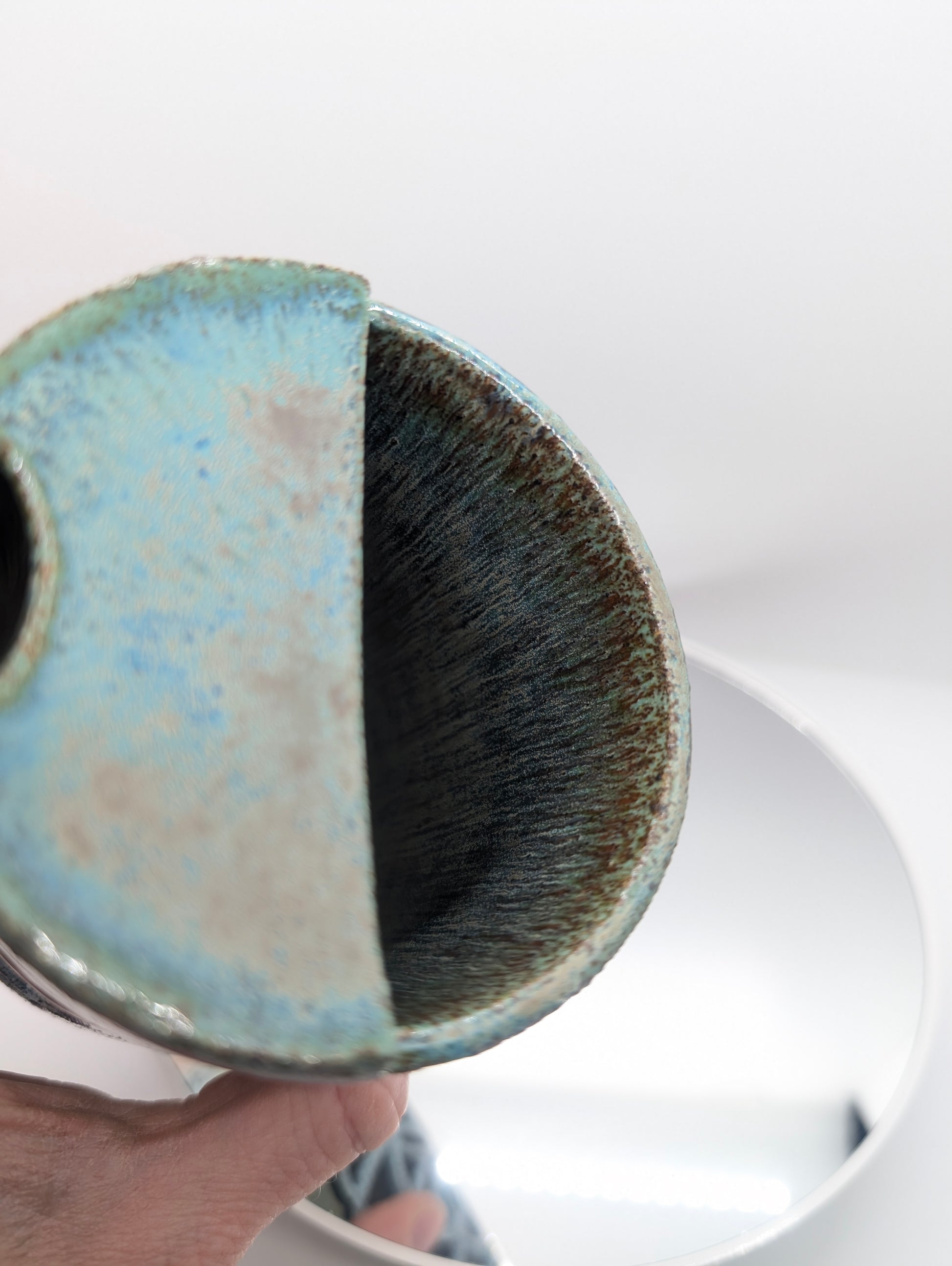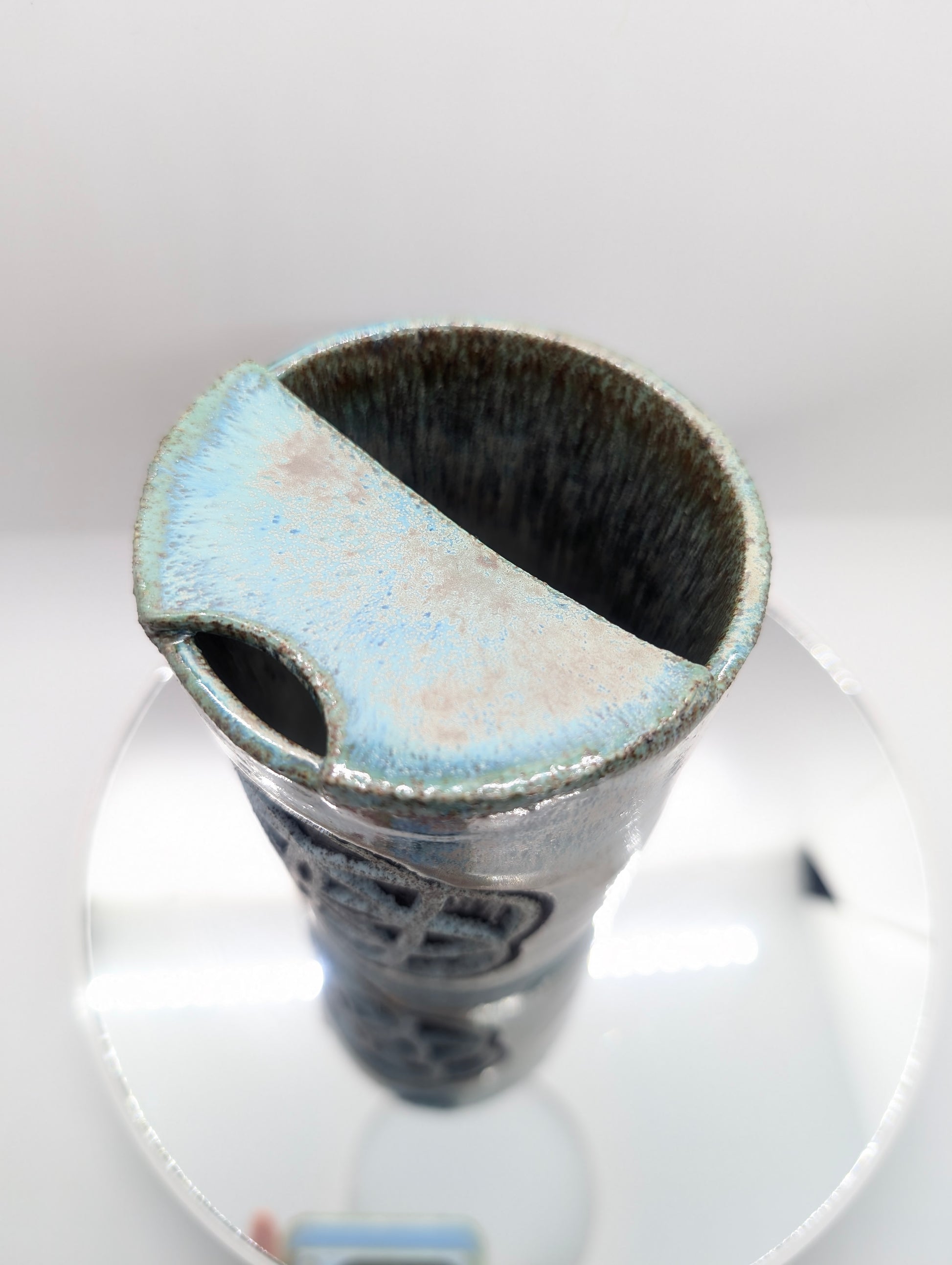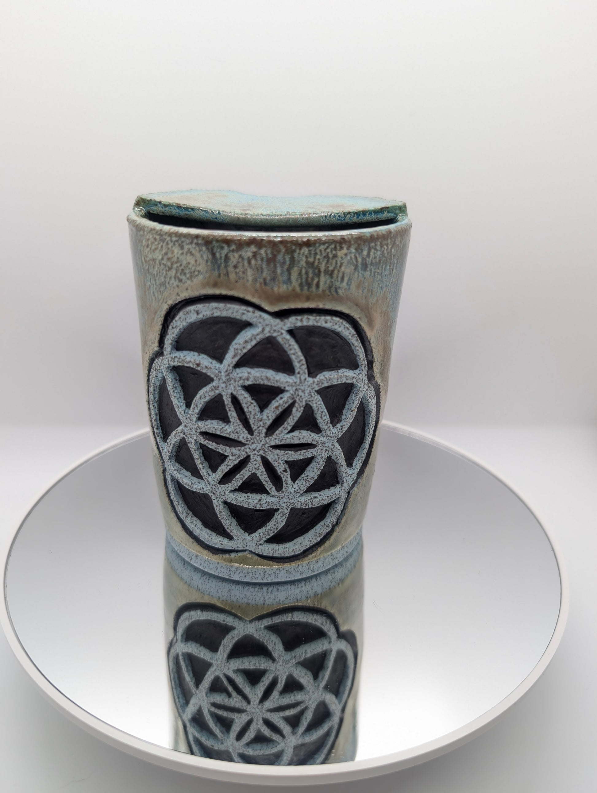 This hand carved and relief painted seed of Life travel mug took hours and hours of carving and painting with a tiny paintbrush. All the love and care I went into making beautifully carved seed of life. The blue porcelain peeks out from the glaze and the underglaze lighting up the design and leave a lasting impression. These travel tumblers are made to fit 95% of vehicles cup holders to make traveling with your coffee and your favorite cup easy stylish.